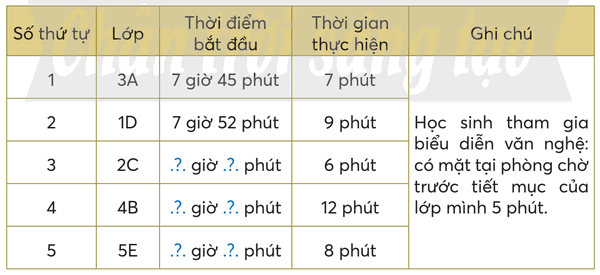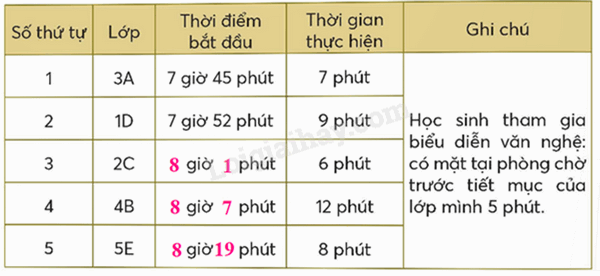 Quan sát bảng thứ tự thời gian biểu diễn văn nghệ của các lớp.